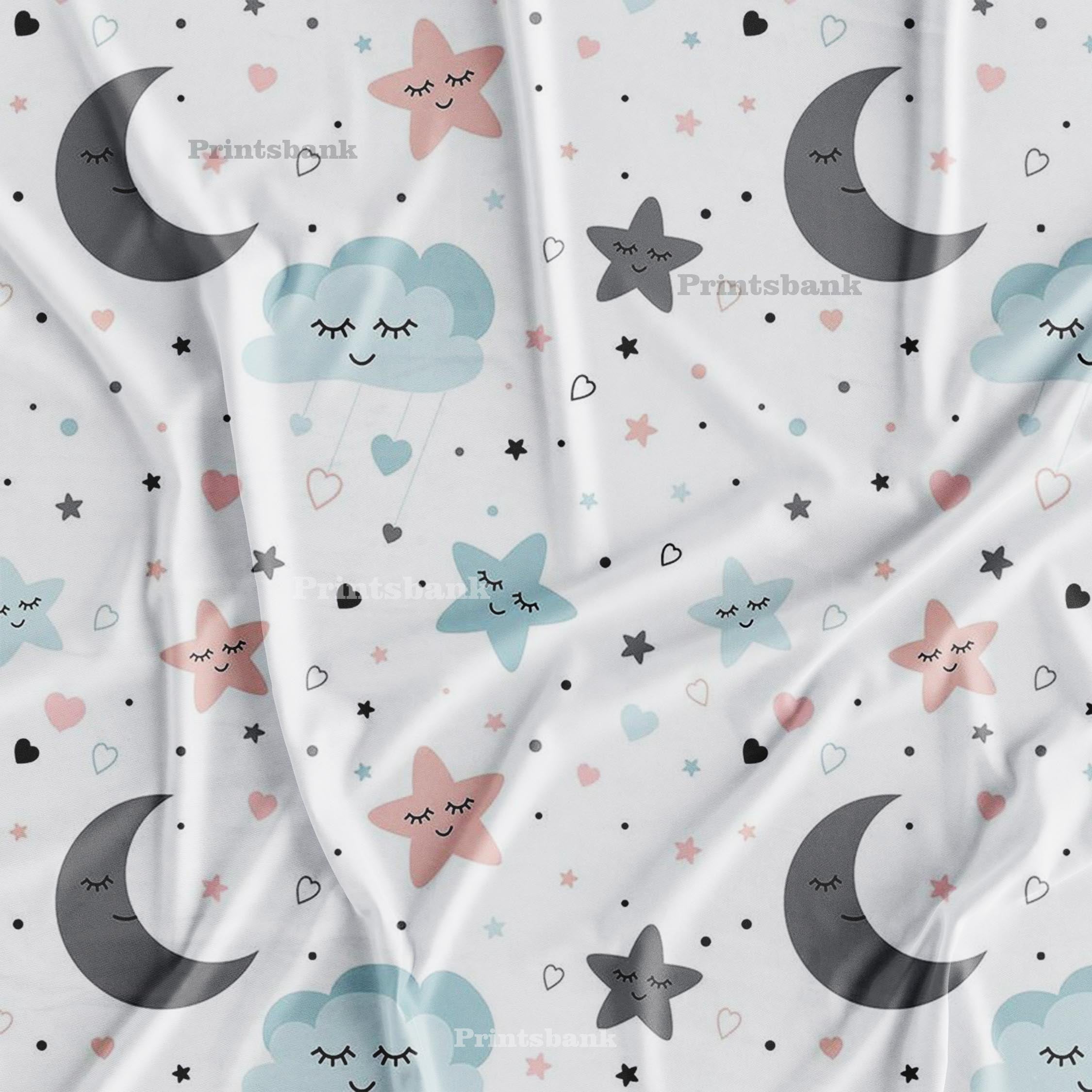Multi Color Star & Moon Kid's White Printed Fabric For Baby