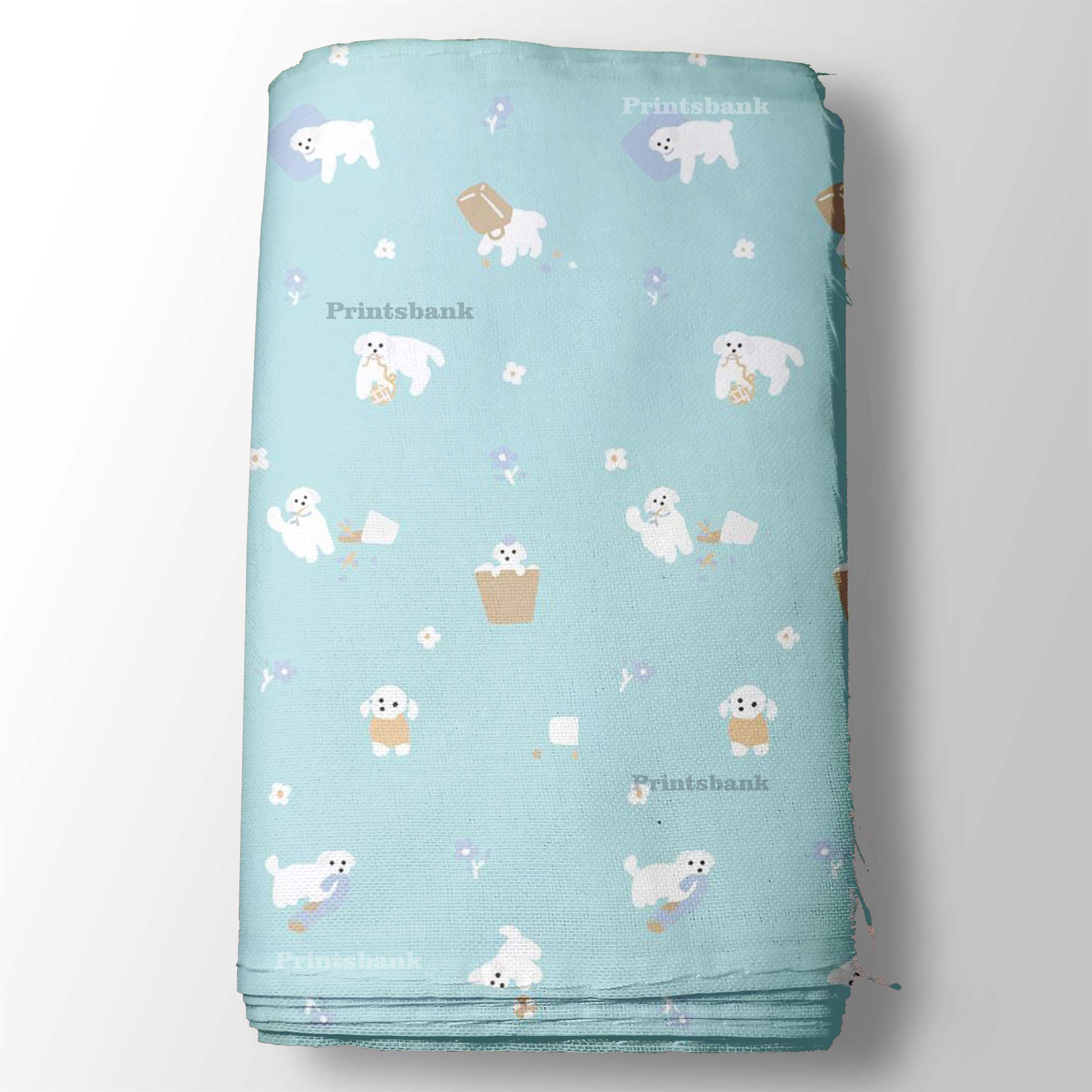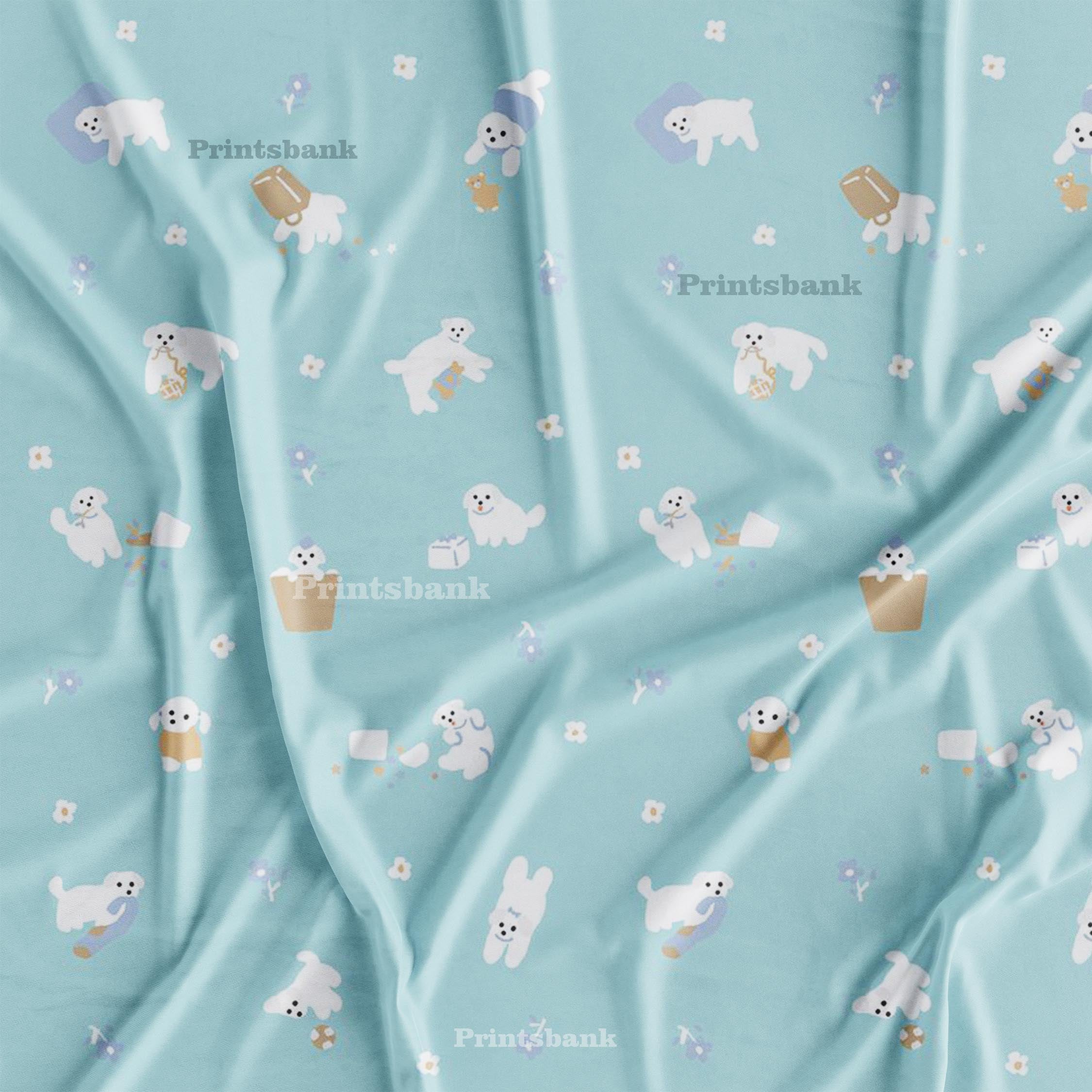 White Cute Dancing Dog Kid's Printed Pastel Blue Fabric